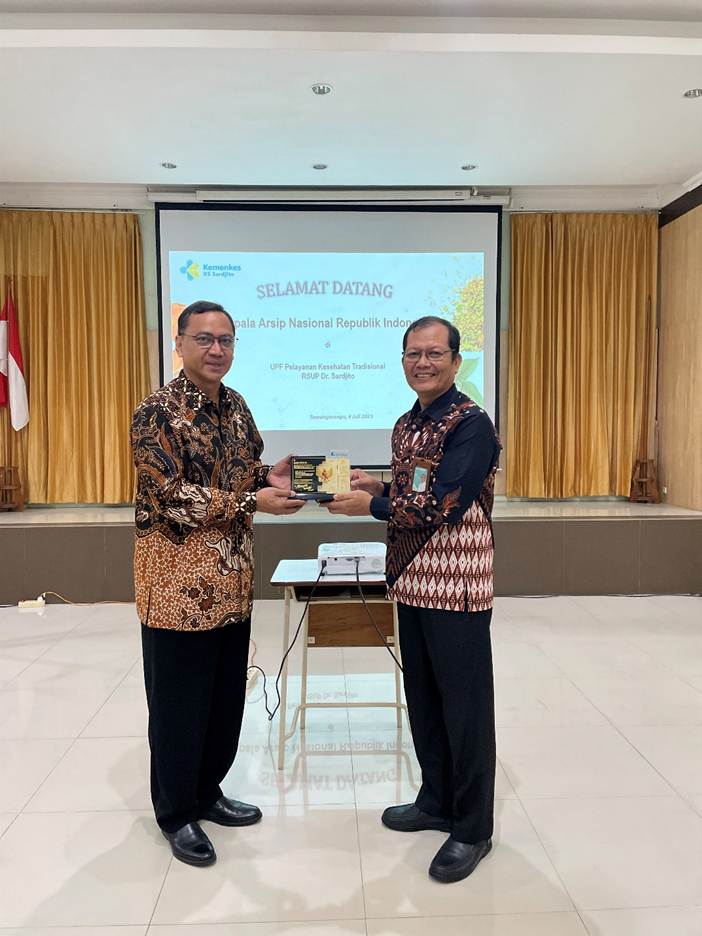 Kepala Arsiparis Nasional Republik Indonesia (ANRI) : Dr. Mego Pinandito, M.Eng memberikan cindera mata kepada Kepala Biro Umum Kementerian Kesehatan : Sjamsul Ariffin, SKM., M.Epid dalam acara kunjungan Kepala ANRI di UPF Pelayanan Kesehatan Tradisonal RSUP Dr Sardjito, DI Yogyakarta pada tanggal 4 Juli 2025